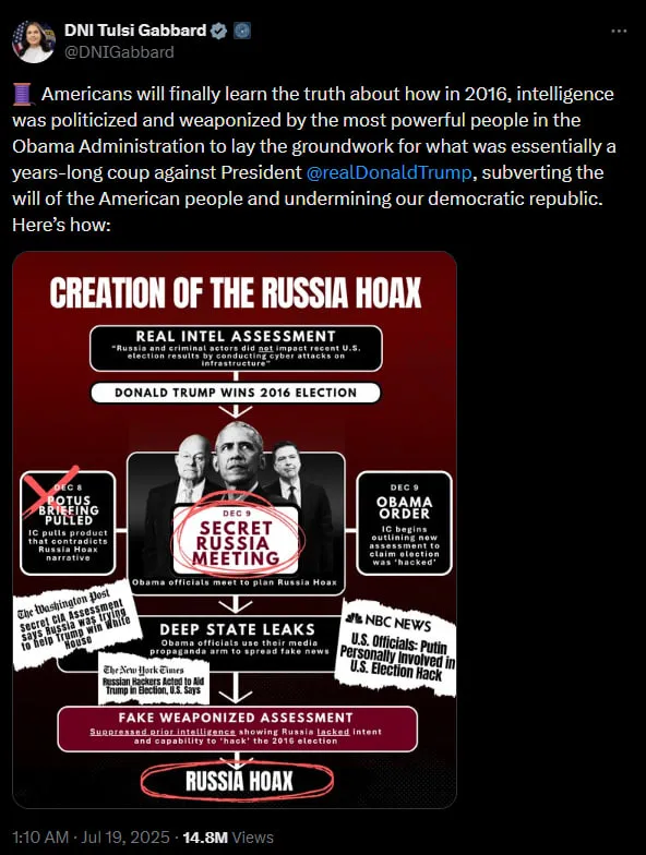 WASHINGTON, D.C. — In a move that has sent shockwaves through the intelligence community, Director of National Intelligence (DNI) Tulsi Gabbard released a declassified memo on Friday that appears to dismantle the long-standing "Russiagate" narrative. The document provides the clearest evidence to date that high-ranking officials in the Obama administration were informed that Russia played no significant role in Donald Trump’s 2016 victory, even as they launched the "Crossfire Hurricane" investigation.